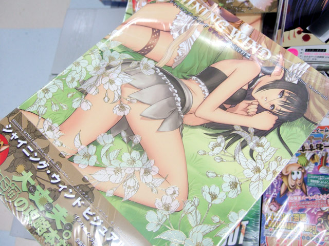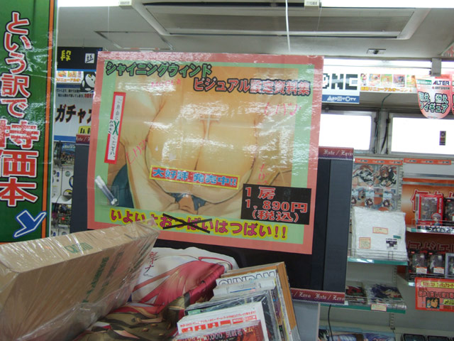 8月30日、「シャイニング・ウィンド ビジュアル設定資料集」(AA)が発売されました。これは、オビによると「瞳で味わい心で感じる珠玉の美麗イラスト集」というもので、パンツも解禁してたもの。ゲームシティでは、「ご自由におかけおかきくださいぱい。」「いよいよおっぱいはつばい!!」「1房1.890円(税込み)」等とした超巨大な乳POPが。店内BGMは「チチをもげ!」w