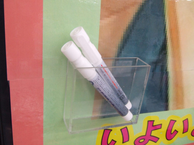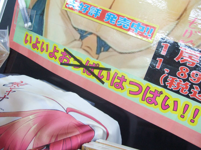 その超巨大乳POPには、「ご自由におかけおかきくださいぱい。」「いよいよおっぱいはつばい!!」「1房1.890円(税込み)」等とか彼、強く振るとぴゅッとインクが飛び出しちゃうホワイトマーカーも設置w