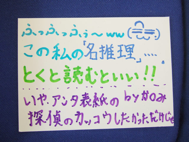 ゲーマーズ本店のPOPでは「ふっふっふぅ〜ww この私の「名推理」・・・・。とくと読むといい!!いや、アンタ表紙の探偵のカッコウしたかっただけじゃ byか○み」や「原作者もビックリ!!」といったPOPが掲示されていました。