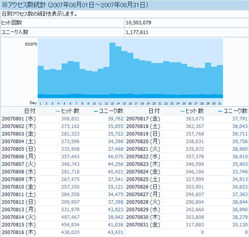 総ヒット数は1050万3079。総ユニーク数は117万7611でした。トップページへのアクセス116万0825PV。(内、新環境トップは163万4039、旧ライブドアブログトップは2万5417)