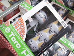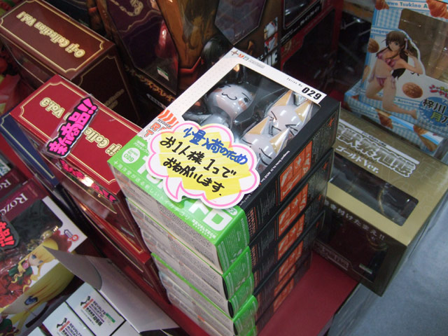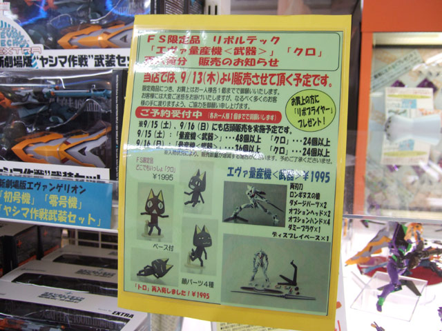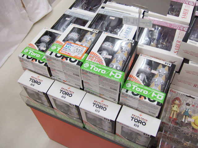 9月8日、6月15日に発売され、比較的早い段階でアキバでは完売状態となった、海洋堂「リボルテック No.029 井上トロ」(AA)の再販が入荷していました。これは、「可愛らしさを前面に押し出して、初のアクションフィギュア化」という、「どこでもいっしょ」のキャラ「井上トロ」をリボルテックで立体化したもの。他、「井上クロ」「エヴァ量産 武器」の再販は13日頃入荷というPOPも。