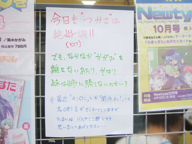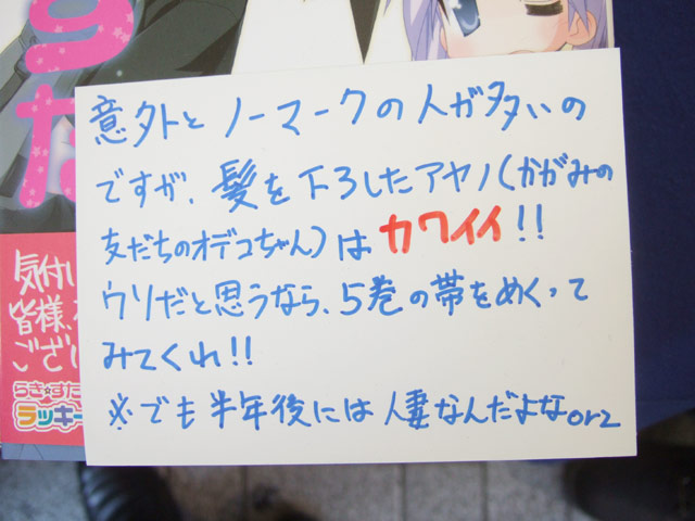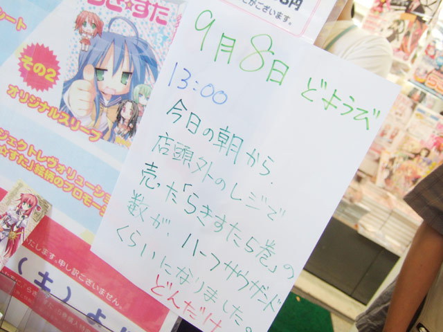 ただのネタだと思ったら、秋葉原限定のらき☆すた秋まつりの「美水かがみ先生サイン会」の抽選券、スタンプラリーカード配布の効果なのか、店員さんのお話によると4倍こなた買い(12冊)していった方はいたみたいですw