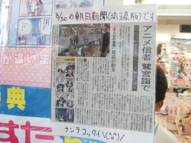 他、8月30日の朝日新聞(埼玉県版)の記事「アニメ信者 鷲宮詣で」の記事の切り抜きも掲示されていました。