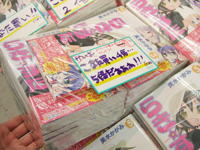 他、「常用、布教用、保存用の3冊は必要だよね。」というこなたの買い方に習って(?)か、5巻を何冊かまとめてパックにしたものも並んでいました。