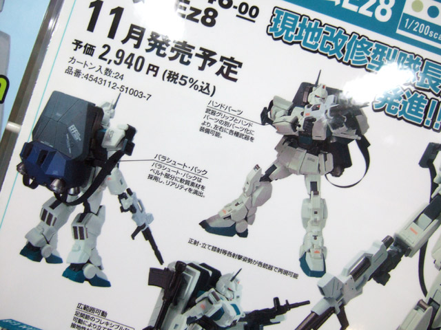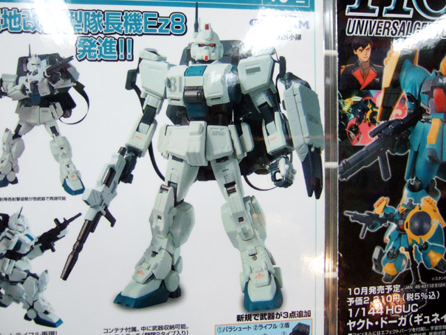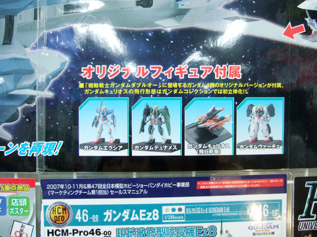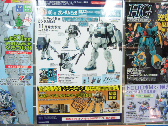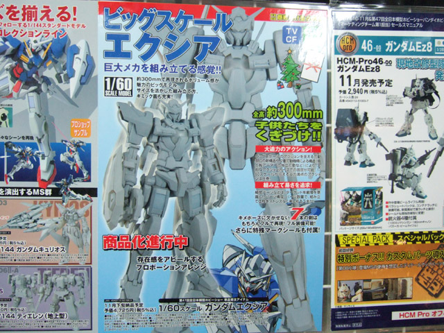 キャラシティにて、10、11月発売のバンダイのガンダムもの新作POPの掲示が開始していました。それによると、「HCM-Pro46-00 ガンダムEz8」(AA)が11月に発売されるみたいです。他、「ガンダムコレクション ガンダム00 プトレマイオス」(AA)、「HG 1/144 ガンダムエクシア」(AA)、「HG 1/144 ガンダムティエレン(地上型)」(AA)等の00関係が多数ラインナップされてました。