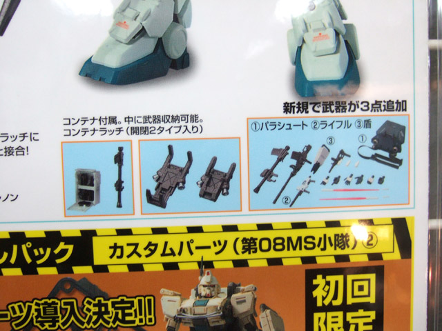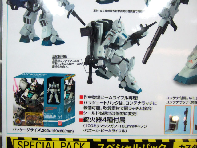 現地改修型隊長機Ez8発進!作中登場ビームライフル再現!パラシュートパックは、コンテナラッチに装備可能。軟質素材で肩ラッチと接合!シールドも現地改修型に変更!銃火器4種付属(100ミリマシンガン・180mmキャノン・バズーカ・ビームライフル)