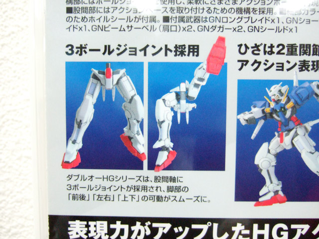 機体の特徴でもある胸レンズ部、肩ベルト部を別素材で再現することで仕上がりUP!股関節に新機構「スリーボールアクション」を採用し上下可動、脚前後可動の動きにより、自然なアクションポージングがきまり、表現力UP!さらにポージング表現を豊かにするため、キメポーズのきまる表情ある平手が付属。肩機構部にはボールジョイントを使用し、柔軟にさまざまなアクションポーズを再現可能。股間部にはアクションベースを取り付けるための機構を採用。細部カラー再現のためホイルシールが付属。付属武器はGNロングブレイド×1、GNショートブレイド×1、GNビームサーベル(肩口)×2、GNダガー×2、GNシールド×1