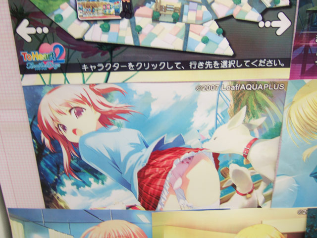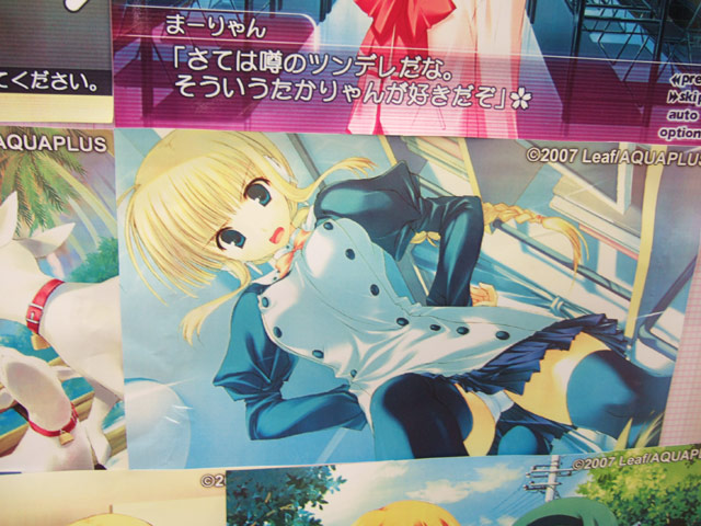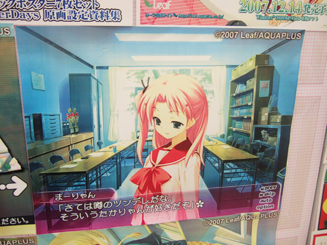 以前お伝えしたコンプティーク10月号には、見えそうで見えないタマ姉や、ネコ耳、白スク水の奈々子、水着姿のちゃるとよっち等のイベントCGが掲載されていたりしましたが、ソフマップアミューズメント館1Fの予約コーナーでは、公式でも紹介が開始している、たくらみ顔のまーりゃん先輩が「さては噂のツンデレだな。そういうたかりゃんが好きだぞ。」と話していたり、驚いた表情の河野はるみ、困ったような表情のイルファ、マップ画面等の、ゲーム画面のサンプル画像も掲示されていました。