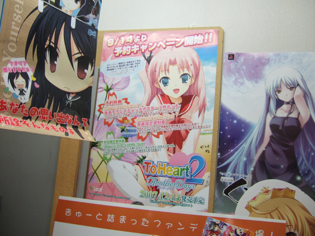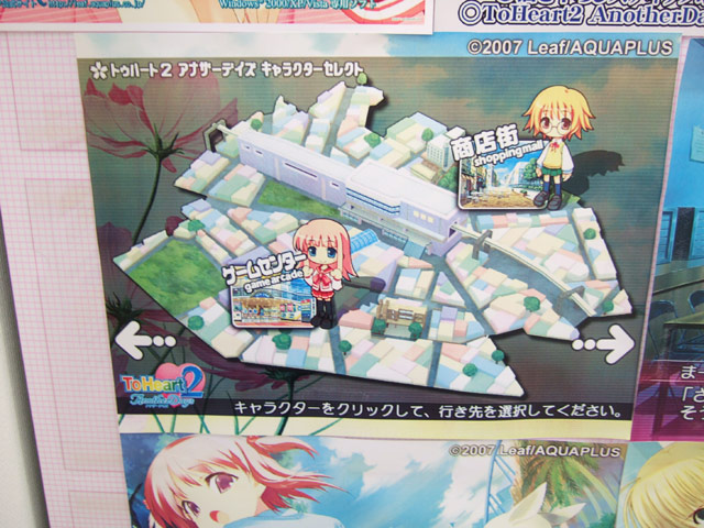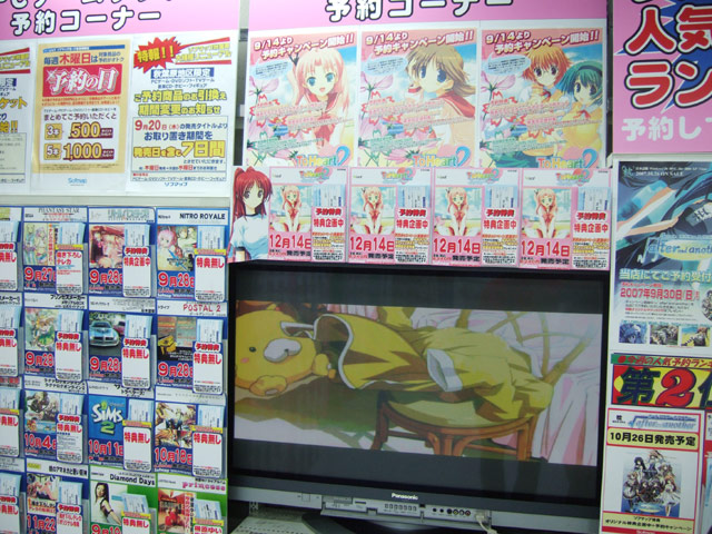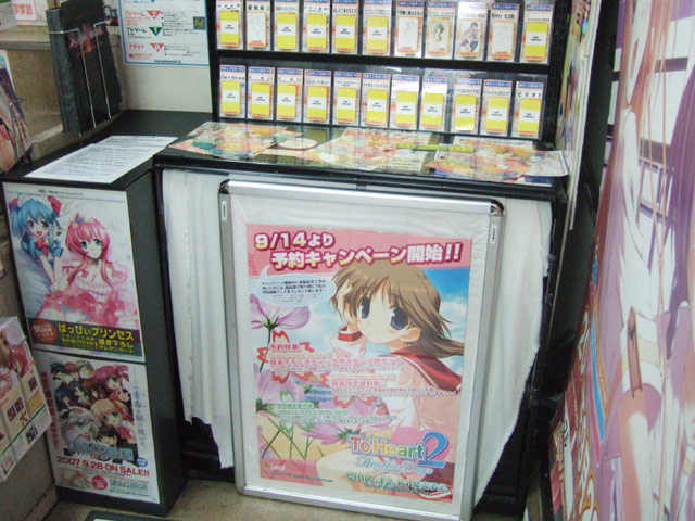 以前、予約特典告知展開等をお伝えした、Leaf「ToHeart2 AnotherDays」(AA)の予約が14日に解禁となり、アキバの各取扱店でもいっせいに予約受付が開始していました。13日にオープンしたソフマップアミューズメント館でも予約コーナーに大きく展開し、まーりゃん先輩が「さては噂のツンデレだな。そういうたかりゃんが好きだぞ。」と話しているゲームサンプル画像等も掲示。