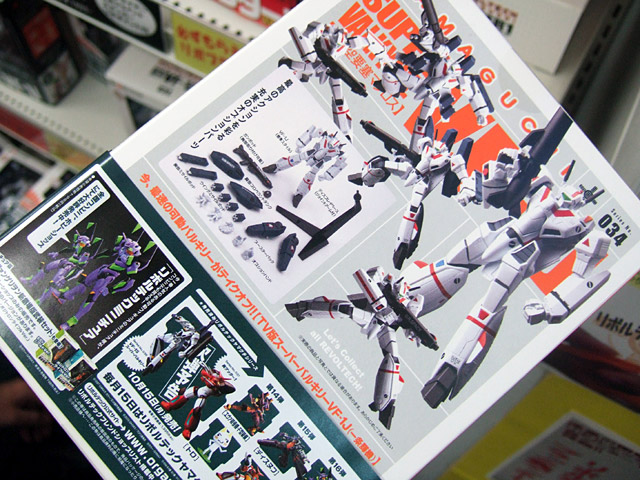 海洋堂「リボルテックヤマグチ No.34 TV版 スーパーバルキリーVF-1J」(AA)のパッケ表裏と、海洋堂ホビーロビーで展示されているサンプル。