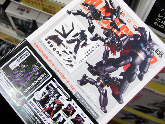 海洋堂「リボルテックヤマグチ No.35 OVA版 ブラックゲッター(真ゲッターロボ)」(AA)のパッケ表裏と、海洋堂ホビーロビーで展示されているサンプル。