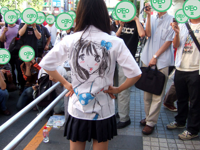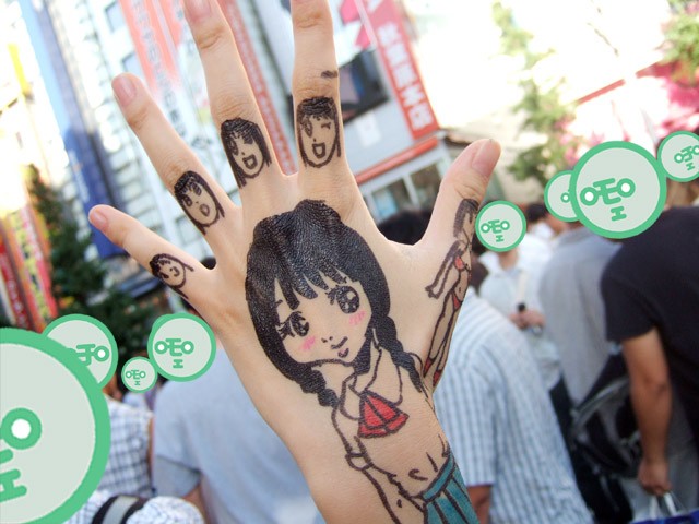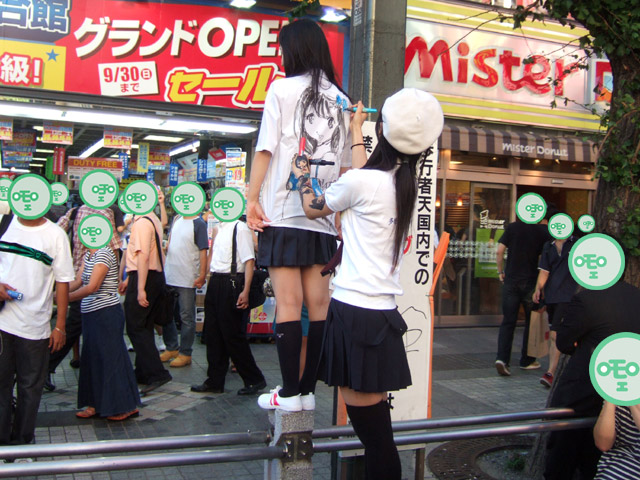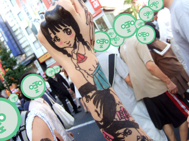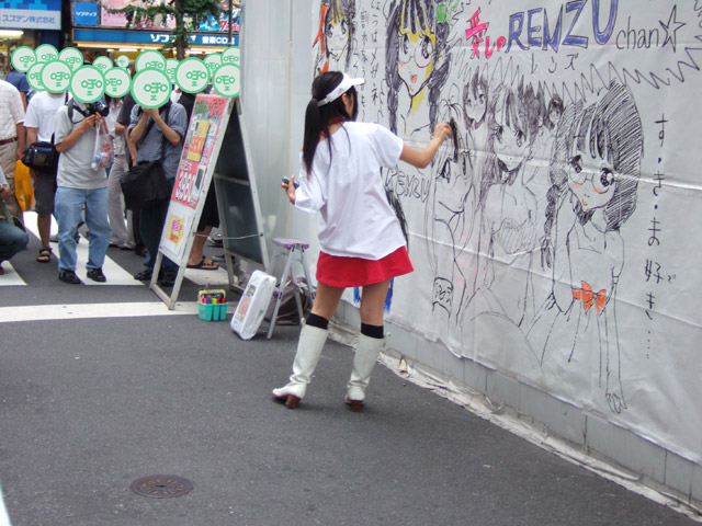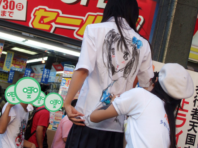 以前、アキバで巨大な美少女画を描く女性がいましたとしてお伝えした、即興で巨大な美少女画を描くペインティング大道芸「路上ライブペインティング」をしていた愛☆まどんなさんが、9月16日にもアキバにこられていて、この日は巨大美少女画ではなく、女体の背中のシャツをキャンパス変わりにイラストを描いていました。愛☆まどんなさん自らの腕にもイラストが。