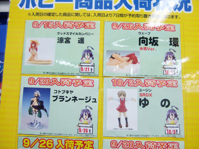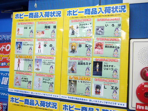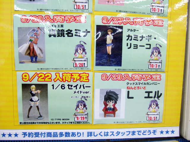 いままで閉店したソフマップ旧本店で告知のあった、ソフマップの入荷予定表ですが、9月13日にオープンしたソフマップアミューズメント館で継続して告知を出すみたいで、4Fにて告知展開が開始していました。それによると、アルター「1/6 セイバー(メイドVer.)」(RA)は9月22日頃入荷予定みたいです。他、グッスマ「サムライスピリッツ天下一剣客伝 いろは」(AA)等の予定日も。