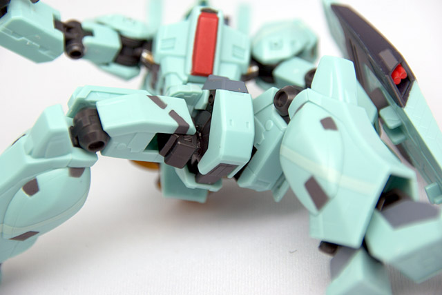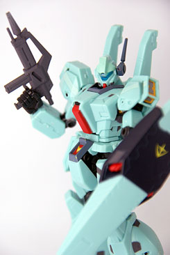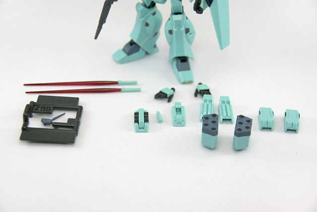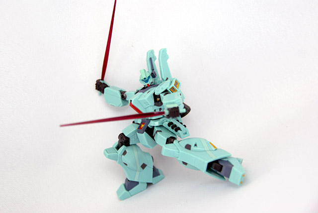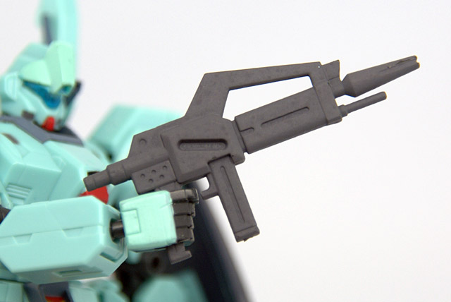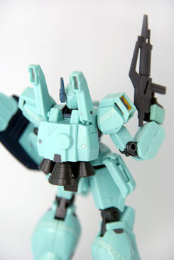 ビームサーベルx2、ABS製アンテナ(デフォでは柔らかいPVC製)、開き手左右の他、腕部ラック用のノーマル、サーベル、グレネードラック、腰ラック用のサーベル、ロケット、グレネードラックがそれぞれ左右用に2個ずつ付属と、大きな武器はないですが、様々なバリエーションを作れる、量産機ならではの豊富なオプションがうれしいですな〜w