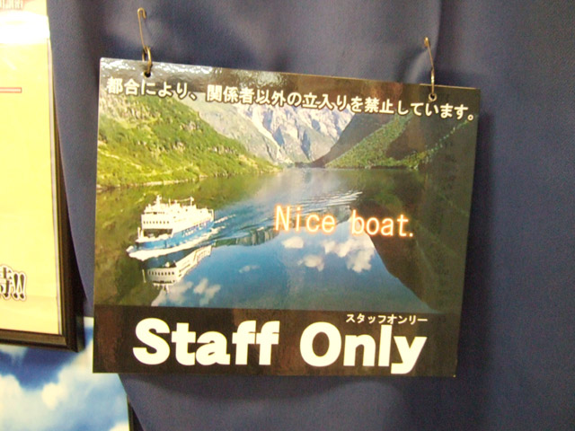 また、メッセ3号店では、スタッフオンリーエリア前の立ち入り禁止ボードに「都合により、関係者以外の立入りを禁止しています。」とかかれ、「Nice boat.」の画像となっていましたw