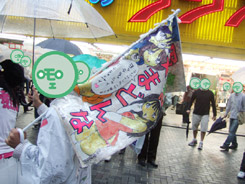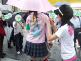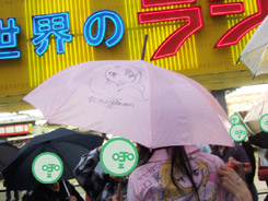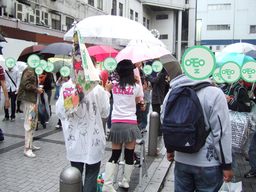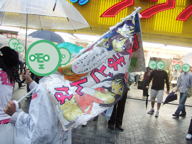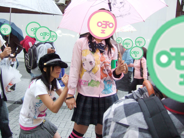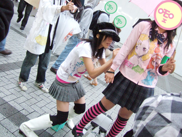 以前、アキバで巨大な美少女画を描いていたり、今度は女体の背中にイラストを描いていたりしたことをお伝えした、ペイントパフォーマーの愛☆まどんなさんが、雨の降ってホコ天が中止となり、「みなさんイソイソ帰られてました〜 お客さんがいないのなんのってぇ!!えらいこっちゃ。」となったらしい、9月30日のアキバでも傘を差しながらミニスカ&ニーソ姿で女体ペイントを行っていました。