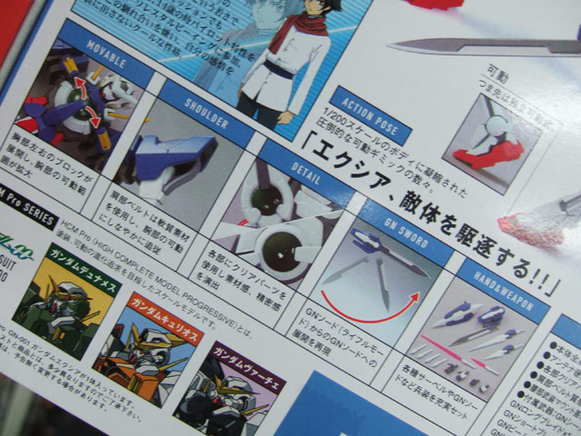 これは、以前お伝えしたファーストグレード同様、2007年10月から放送開始予定の「機動戦士ガンダム00」の主人公「刹那・F・セイエイ」の搭乗機「ガンダム エクシア」をHCM-Proにしたもので、Amazonの商品説明によると「胸部左右のブロックが展開。腕の可動範囲が拡大。特徴的な腕のハーネスを軟質素材を使用し、質感を演出。腕部の可動にしなやかさを追従。頭部・足部・胸部など各所にクリアパーツを使用。MSの設定を忠実に再現。7本の剣を使用するガンダムエクシア。その武器、武装を全て同梱。多彩なアクションシーンを再現可能。」と紹介されています。