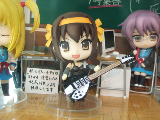 以前、ねんどろいどの「夜神月」(AA)と「長門有希」を組み合わせた、「夜神月子」の展示もあったとらのあな本店にて、今度は先日発売された「弥 海砂」(AA)のボディと「涼宮ハルヒ」(AM)(参考レビュー)のヘッドを組み合わせて、「BECK ギター コレクション」(AA)のギターを持たせた「激奏風ハルヒ」が展示されていました。