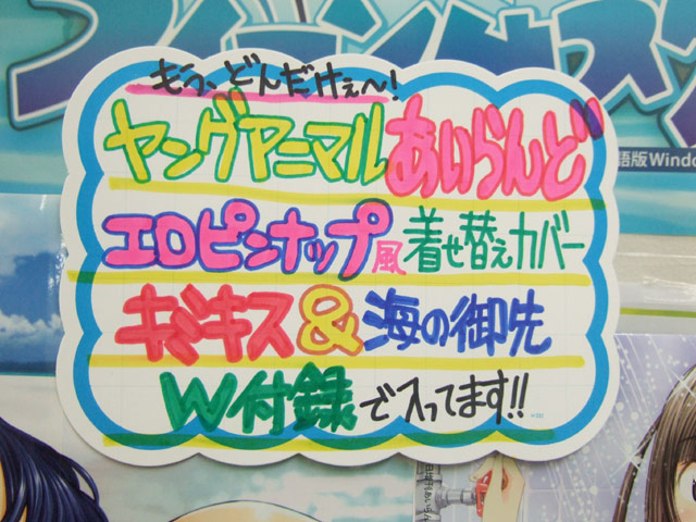 9月28日、「ヤングアニマル あいらんど Vol.6」(AA)が発売されました。今回、メロンのPOPによると「もう、どんだけぇ〜!〜エロピンナップ風着せ替えカバー」と書かれている、キミキス2巻(AA)と海の御先 1巻(AA)の「単行本SEXY別カバー」が付属しています。左の画像はそのキミキス別カバーの一部。他、東雲太郎氏による、先生メインの全キャラ登場キミキスコミック等も掲載。