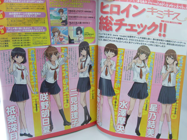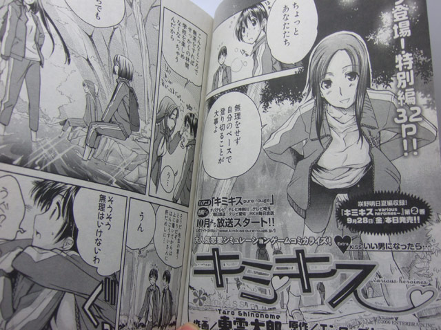 他、綴じ込みピンナップでは、表面が10月より放送スタート予定の「キミキス pure rouge」のヒロイン5人の温泉イラスト、裏面が東雲太郎氏版キミキスの、ヤル気満々の表情に、タイトスカート姿で上にまたがる摩央姉のイラスト。