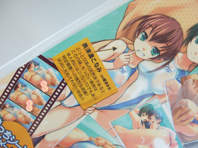 これは、掲示されていたポスターでは「競泳水着好きでしょ!」とされていたもので、メロンブックスの商品説明「地元スイミングスクールに通っている主人公と姉妹がひたすらエロスをするADVです。スイミングスクールを舞台に、二人の水着少女が主人公を巡るえっちな勝負!原画には『水着彼女』でお馴染み『ぼっしぃ先生』が担当。濡れ透けフェチも納得です!おっぱいもお尻もぷるぷる〜ん♪全えっちシーンがなめらかアニメーションはもちろん、スケスケ(School指定水着)orテカテカ(Technology-X水着)よりお好みの水着を選択可能、ヒロインの愛情度がわかる【ありなフラグ&こなみフラグ】など多彩なシステムを搭載!」と紹介されています。