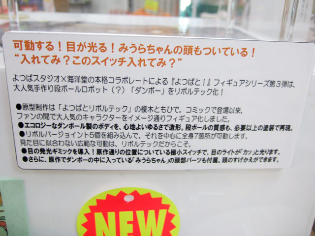 9月27日、海洋堂「よつばと リボルテック」(AA)が発売されました。これは、以前サンプルもお伝えした『ちょっとかわった女の子「よつば」と、とーちゃんと、まわりの人たちとのなにげない日常を描いたマンガ』「よつばと!」の「よつば」をリボルテックにしたもの。海洋堂HLでは自作のダンボーも展示。他の店舗では1/1ダンボーや自作ミニダンボー等がw