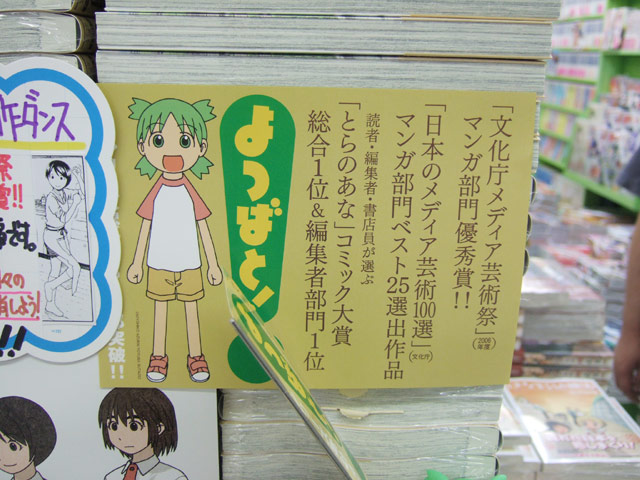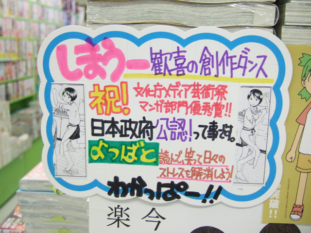 メロンブックスでは、よつばと!が2006年度「文化庁メディア芸術祭」マンガ部門優秀賞等を受賞したことからか、POPに「日本政府公認!」等とかかれていました。