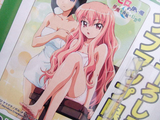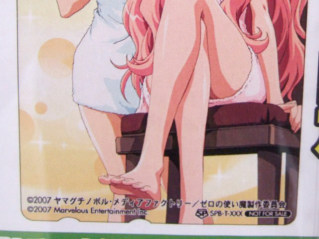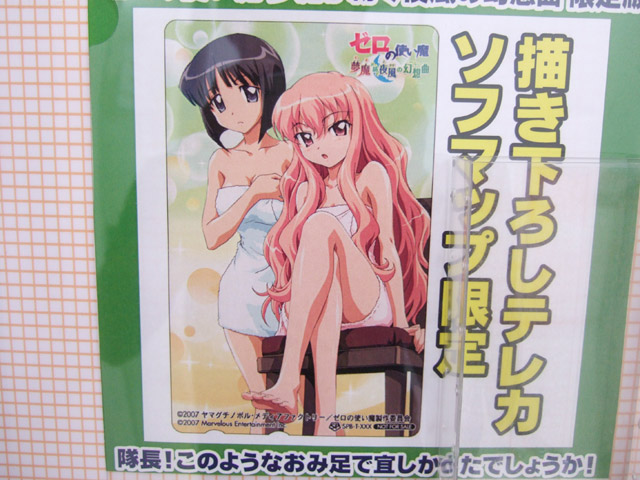 以前、ゲーマーズ特典テレカイラストがタバサとルイズのニャンココスであることをお伝えした、「ゼロの使い魔〜夢魔が紡ぐ夜風の幻想曲〜」(AA)ですが、ソフマップアミューズメント館にて、ソフマップのショップ特典のテレカイラストが公開されていました。POPには「隊長!このようなおみ足で宜しかったでしょうか!」とかかれ、やっぱり足裏テレカでしたw