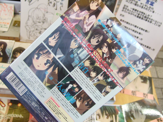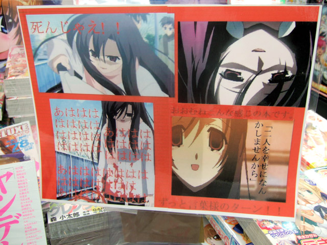 9月25日、DVD「School Days 第1巻(初回限定版)」(AA)が発売されました。ゲーマーズ本店では店頭で、「ヤンデレ」とかかれた大きなPOPを掲示し、その周りに“ヤンデレ”級 1位や、ヤンデレ大全発売時に「しんじゃえPOP」などもあった言葉様の様々なシーンが。他のPOPでは「まだ、西園寺さんやその他の人たちに邪魔される前の楽しかった頃のお話ですよ。」