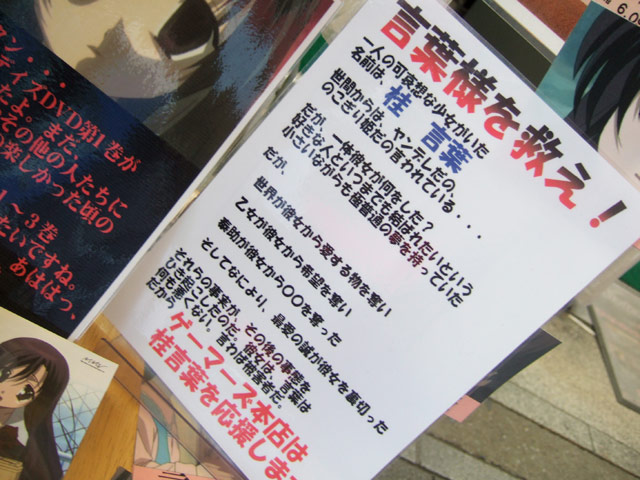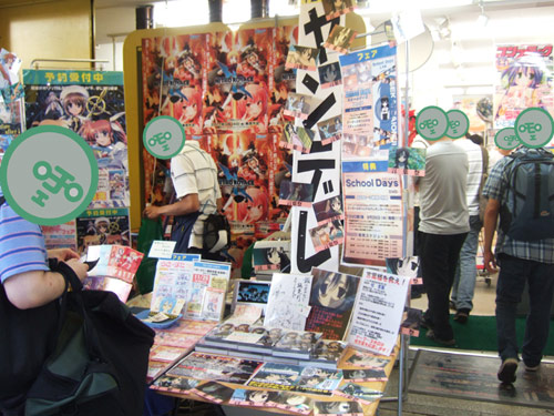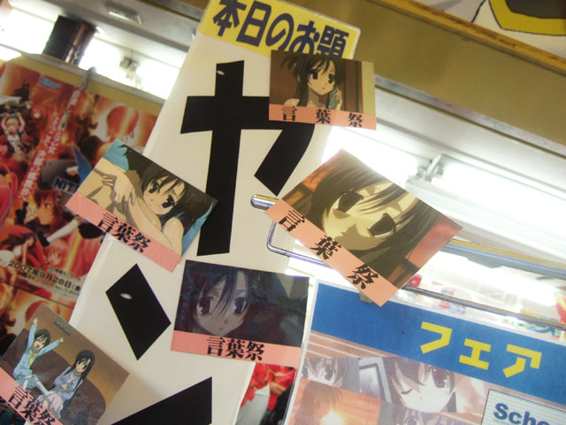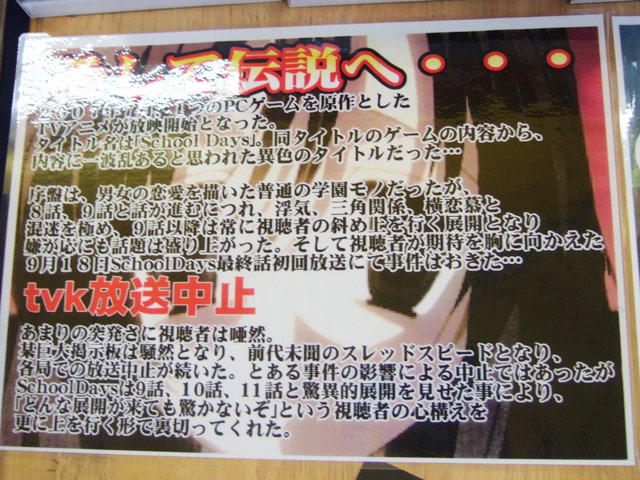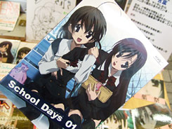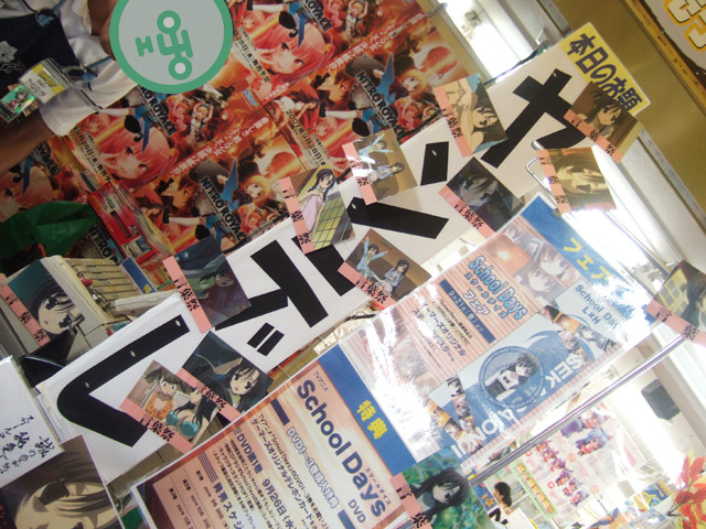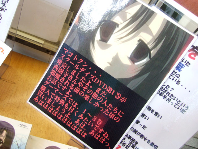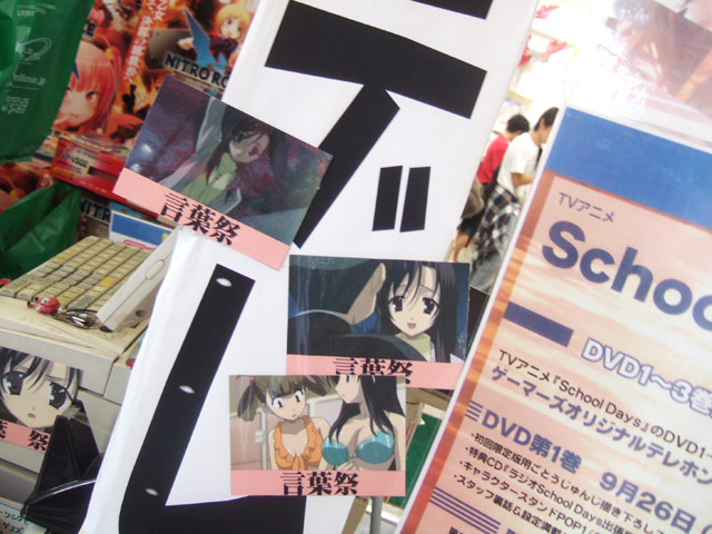 ゲーマーズ本店のPOPでは「マコトクン・・・スクールデイズDVD第1巻が発売しましたよ。まだ、西園寺さんやその他の人たちに邪魔される前の楽しかった頃のお話ですよ。ゲーマーズでは、1〜3巻購入で特典も付くみたいですね。買いましょうよ。あは、あははっ、あはははははははははは」や、「言葉様を救え!一人の可哀想な少女がいた名前は、桂 言葉 世間からは、ヤンデレだののこぎり姫だの言われている・・・ だが、一体彼女が何をした?〜世界が彼女から愛するものを奪い 乙女が彼女から希望を奪い 泰助が彼女から○○を奪った そしてなにより、最愛の誠が彼女を裏切った それらの事実が、その後の実態をひき起こしたのだ。彼女は、言葉は何も悪くない。言わば被害者だ。だからゲーマーズ本店は桂言葉を応援します」や、「そして伝説へ・・・〜序盤は、男女の恋愛を描いた普通の学園ものだったが、8話、9話と話が進むにつれ、浮気、三角関係、横恋慕と混迷を極め、9話以降は常に視聴者の斜め上を行く展開となり嫌が応にも話題は盛り上がった。そして視聴者が期待を胸に向かえた9月18日SchoolDays最終話初回放送にて事件はおきた・・・tvk放送中止 あまりの突発さに視聴者は唖然。〜SchoolDaysは9話、10話、11話と驚異的展開を見せた事により、「どんな展開が来ても驚かないぞ」という視聴者の心構えを更に上を行く形で裏切ってくれた。」など、かなり熱く語っているPOPが多い印象でしたw