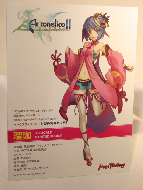 これは、10月25日発売予定の、台詞だけだとどう聞いてもアレしてる会話にしか聞こえない台詞回し等もあった、「アルトネリコ 世界の終わりで詩い続ける少女」の続編「アルトネリコ2 世界に響く少女たちの創造詩(メタファリカ)」のヒロイン「瑠珈(ルカ)・トゥルーリーワース」を、キャラクター紹介ページのイラストをベースに立体化したもので、掲示されていたPOPによると「アルトネリコ2 世界に響く少女たちの創造詩のヒロインの一人『瑠珈・トゥルーリーワース』のフィギュアがマックスファクトリーから早くも発売決定!!」と紹介されています。