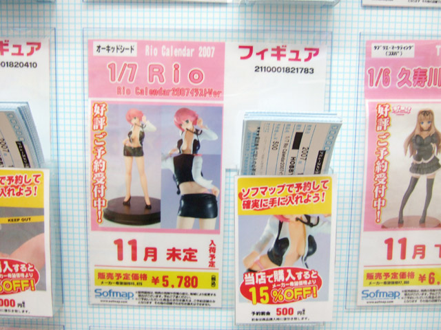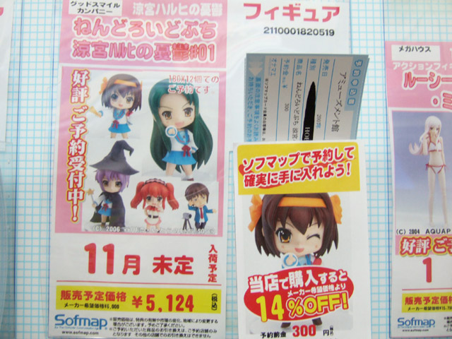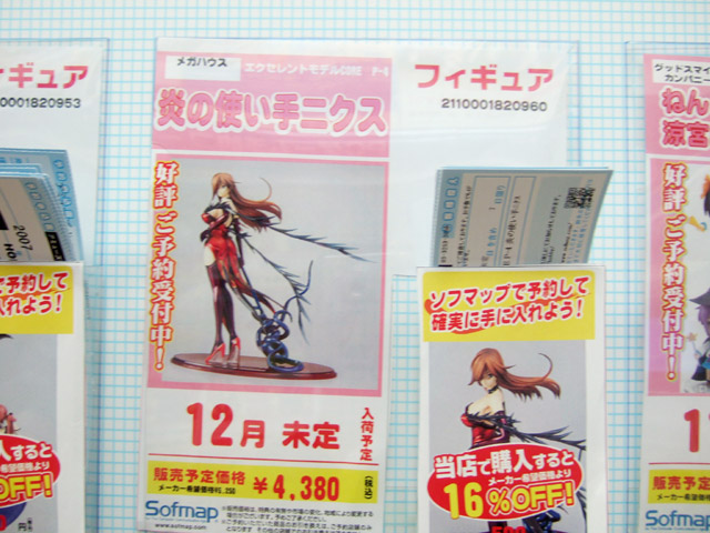 ソフマップでは、グッドスマイルカンパニー「ねんどろいど ぷち 涼宮ハルヒの憂鬱 第1弾」(RA)、メガハウスエクセレントモデルCORE クイーンズブレイドP-4「炎の使い手ニクス」(RA)、冥土へ誘うものアイリ」、オーキッドシード「スーパーブラックジャック -リオ- Rio Calendar 2007」(AM)等の予約受付が開始していました。