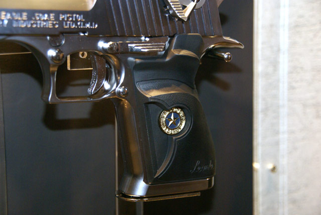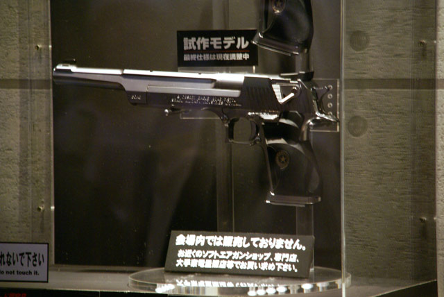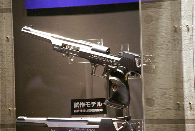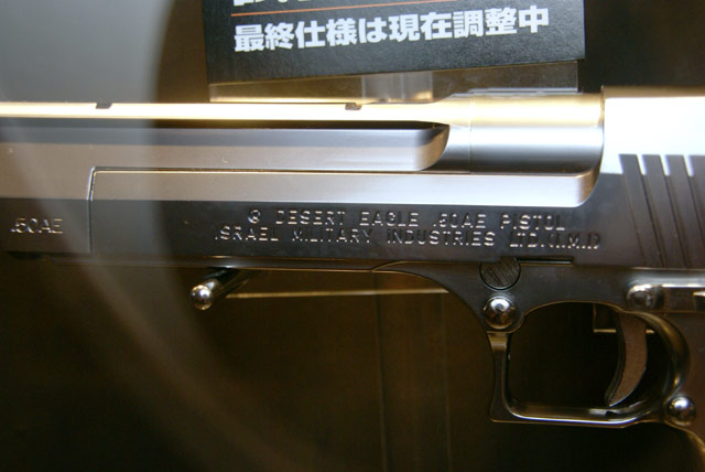 東京マルイ「10インチカスタム デザートイーグル50AE クロムステンレス」展示の様子。