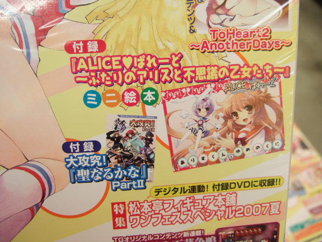 9月21日、「TECH GIAN 2007年 11月号」(AA)が発売されました。今回、14日に予約が開始された「ToHeart2 AnotherDays」(AA)の、コンプティーク10月号でも掲載されていた、ネコ耳、白スク水姿にさらにランドセルを加え、お尻をこちらに向けた奈々子イラストのファンシーペーパーなどが付属しています。他、9月21日のよろずねたを。