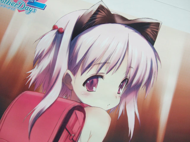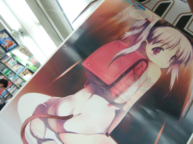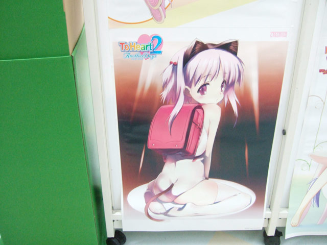 また、14日に予約が開始された「ToHeart2 AnotherDays」(AA)の、コンプティーク10月号でも掲載されていた、ネコ耳、白スク水姿にさらにランドセルを加え、お尻をこちらに向けた奈々子イラストのファンシーペーパーなども付属しているようで、ゲームシティではそのイラストも大きく掲示していました。