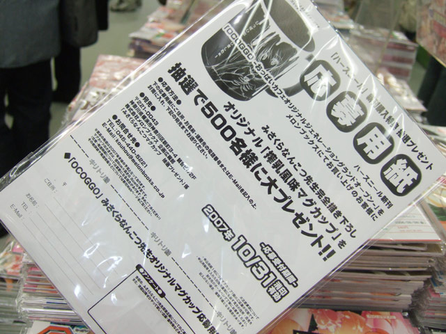 右の画像は、応募すると、抽選で500名にすし屋の湯呑み風にみさくら語満載という、「搾乳風味マグカップ」があたる応募券。