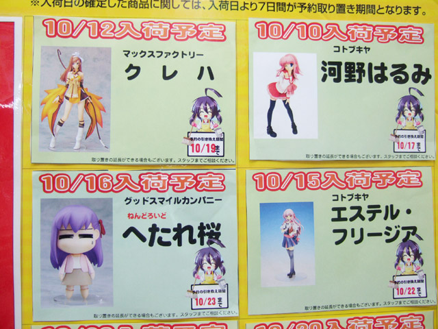 ソフマップアミューズメント館の4Fエレベーター付近で、10月の美少女フィギュア入荷予定日が公開開始されています。それによると、マックスファクトリー「シャイニング・ウィンド クレハ」は10月12日入荷予定みたいです。他、コトブキヤ「夜明け前より瑠璃色な エステル・フリージア」(AA)、グッドスマイルカンパニー「ねんどろいど へたれ桜」(AA)等の発売予定日なども掲示。
