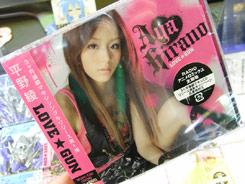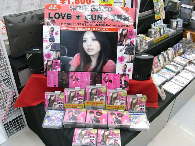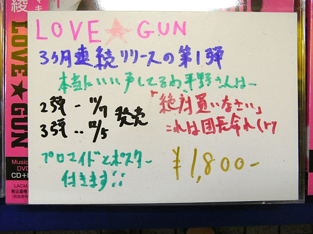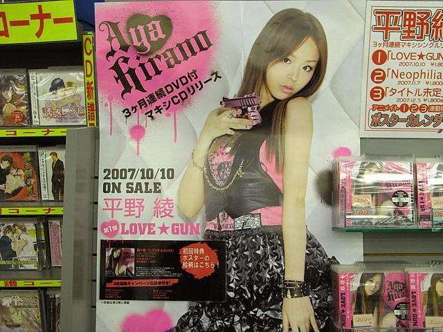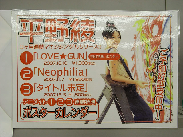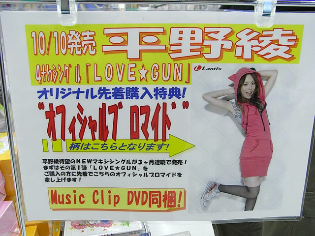 これは、「涼宮ハルヒの憂鬱」の涼宮ハルヒ役、「DEATH NOTE」の弥海砂役、「NANA」の芹澤レイラ役、「らき☆すた」の泉こなた役等を担当された、声優の平野綾さんの4枚目のマキシシングルとなるもので、掲示されていたPOPの解説によると「第1弾はクラッシュ!ピンク×ブラックを基調としたビジュアルデザインで今の平野綾を表現!「LOVE☆GUN」では作詞を平野綾自身が担当。今、平野綾が思うこと、感じることをストレートに表現しました。映像ではかっこいい!そしてかわいい平野綾が見れちゃいます。」と紹介されています。