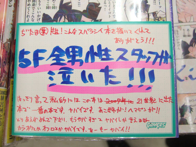 ゲーマーズ本店のPOPによると「ぢたま某先生!こんなスバラシイ本を描いてくれてありがとう!!! 5F全男性スタッフが泣いた!!! はっきり言って私的にはこの本は2007年に21世紀に出た本で一番の本です。ヤバイです。あこ姉が!ヘマピンが!!とりあえずよんで下さい。もうヤバすぎてヤバイしか言えません カラオケとかオフロとかヤバイです。あーもーヤバイ!!」と書かれていましたw