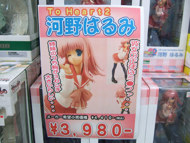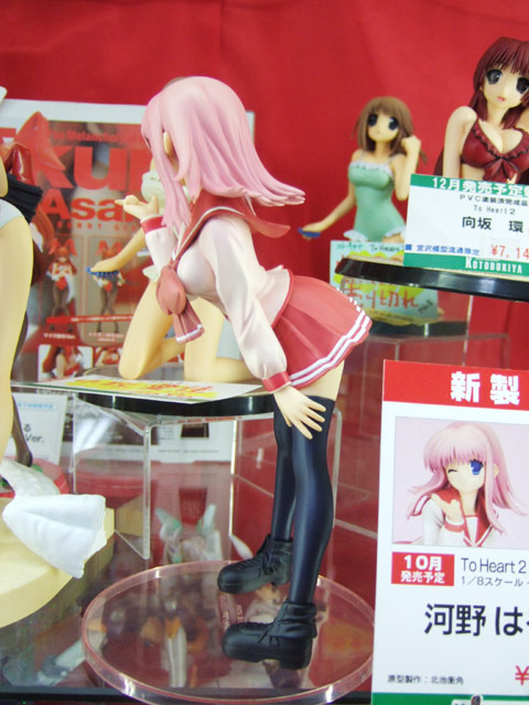 10月12日、コトブキヤToHeart2 AnotherDays 河野はるみ」(AA)が発売されました。これは、以前PVCサンプルもお伝えした、「ToHeart2 AnotherDays」のヒロインの一人で、「どこかで見たことがある人」という、「河野はるみ」を前かがみでウインクしている立ちバッ○ポーズで立体化したもの。キャラシティのPOPには「姉妹のうち胸が3センチ大きいらしい・・・」と書かれてました。