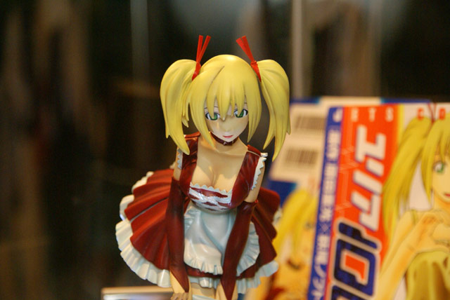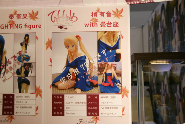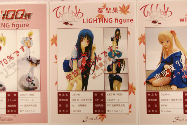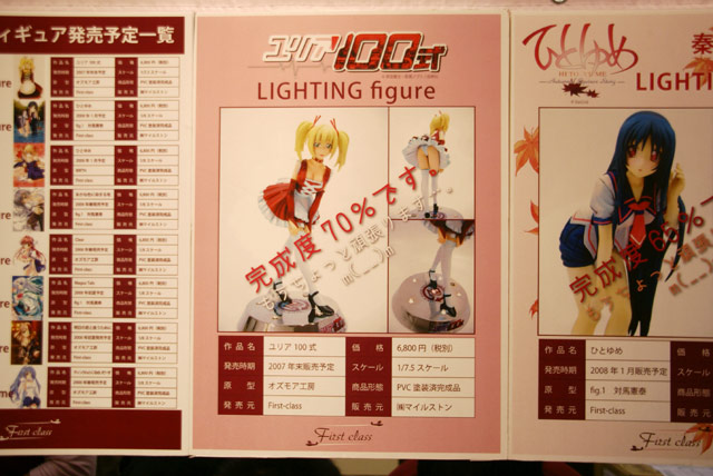 10月14日に開催された、ドリームパーティ東京2007秋にて、フィギュア・グッズの販売などを行う新ブランド「First-class(ファーストクラス)」がブース開設していました。そこにはファーストクラスのフィギュアシリーズ第1弾となる、究極の寸止めダッチワイフマンガ「ユリア100式」のユリア100式、「ひとゆめ」の秦聖果、梢有音、計3体の開発段階のサンプルが展示されてました。