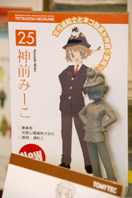 これは、みぶなつき氏デザインのオリジナルキャラクターが、実在の交通事業の制服を着たトレーディングフィギュアシリーズ「鉄道むすめ」の第5弾となるもので、掲示されていたPOPによると『新キャラは「車輌工場勤務」に「運転士&ねこ駅長」、更に今回は人気の社内販売アテンダントを多く収録。そして更に幅広い人気を誇る「鉄道警察隊」も再登場と話題が盛りだくさん!!』と紹介されています。