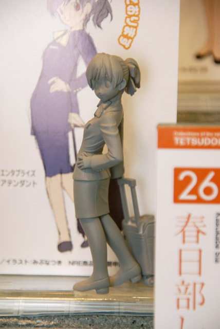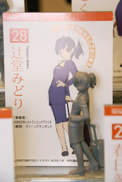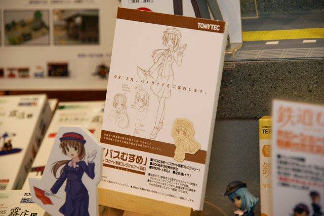 展示では、「鉄道むすめ 鉄道制服コレクション 第5弾 コレクションフィギュア」(AM)の他、「全国のバス事業者で活躍するバスガイドの制服を、コレクションタイプのフィギュアで収録。 キャラクターはオリジナル、制服は実在の事業者からの許諾をいただいて展開いたします。」という、「バスむすめ」が2008年3月発売予定という告知POPも。