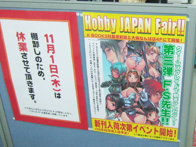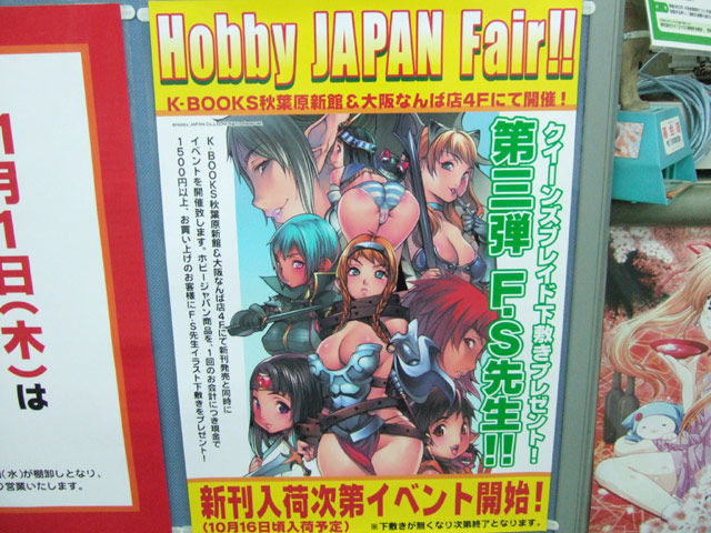 POPによると「K-BOOKS秋葉原新館&大阪なんば店4Fnite新刊発売と同時にイベントを開催致します。ホビージャパン商品を、1回のお会計につき現金で1,500円以上、お買い上げのお客様にF・S先生イラスト下敷きをプレゼント」と書かれていて、絵柄はコミケ71限定「クイーンズブレイドイラスト&原画集 2006冬」の、メナスの具がやばい表紙イラストw