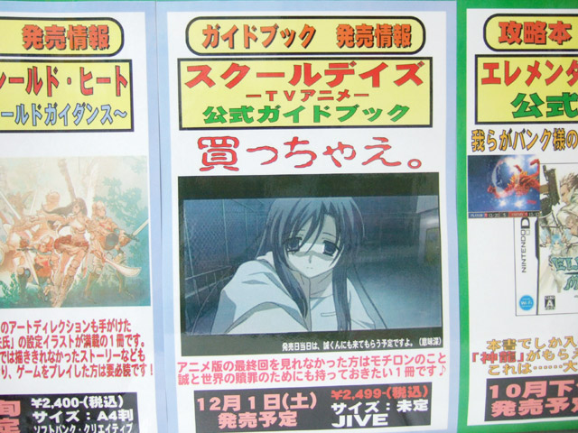 ゲームシティの5Fエレベータ付近にて、「スクールデイズ -TVアニメ- 公式ガイドブック」が12月1日発売予定というPOPが掲示されているのに気がつきました。