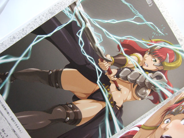 なお、K-BOOKSでは以前お伝えしたように、ホビージャパン商品を、現金で1,500円以上を1回の会計で購入すると、先着で「クイーンズブレイドイラスト&原画集 2006冬」の表紙イラストを用いた「F・S先生イラスト下敷き」がもらえるほか、メローナには股間から棒が生えているようなイラスト、クローデットには鎧解除状態でケツ見せポーズなイラストのイラストペーパーがそれぞれに付属していました。
