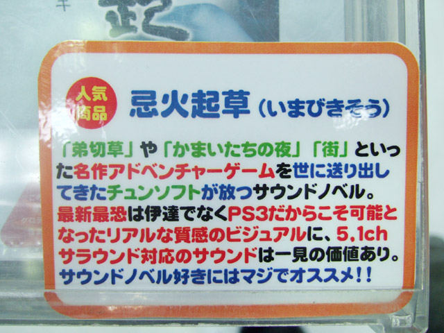 ソフマップアミューズメント館のPOPによると『「弟切草」や「かまいたちの夜」「街」といった名作アドベンチャーゲームを世に送り出してきたチュンソフトが放つサウンドノベル。最新最恐は伊達ではなくPS3だからこそ可能となったリアルな質感のビジュアルに、5.1chサラウンド対応のサウンドは一見の価値あり。サウンドノベル好きにはマジでオススメ!!』と書かれていました。