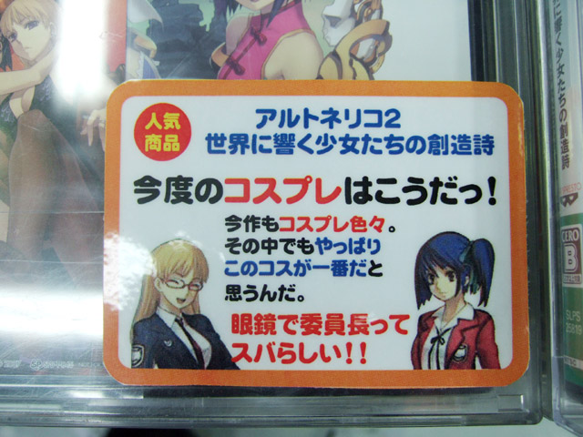 ソフマップアミューズメント館のPOPでは「今度のコスプレはこうだっ!今作もコスプレ色々。その中でもやっぱりこのコスが一番だと思うんだ。眼鏡で委員長ってスバらしい!!」と書かれていました。