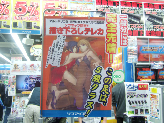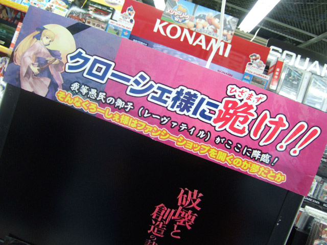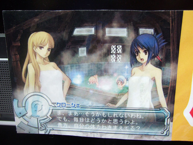 他、ソフマップアミューズメント館では「クローシェ様に跪け!!我等愚民の御子(レーヴァテイル)がここに降臨!そんなくろーしぇ様はファンシーショップを開くのが夢だとか」とされたデモモニターを設置していましたが、その下には「おいおい!デモを見てる場合じゃないぞ!?風呂に行こうぜ!!!」として、お風呂シーンの画像が掲示されていましたw