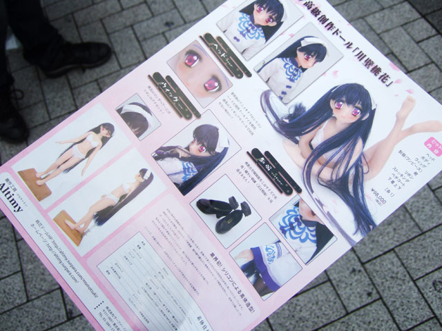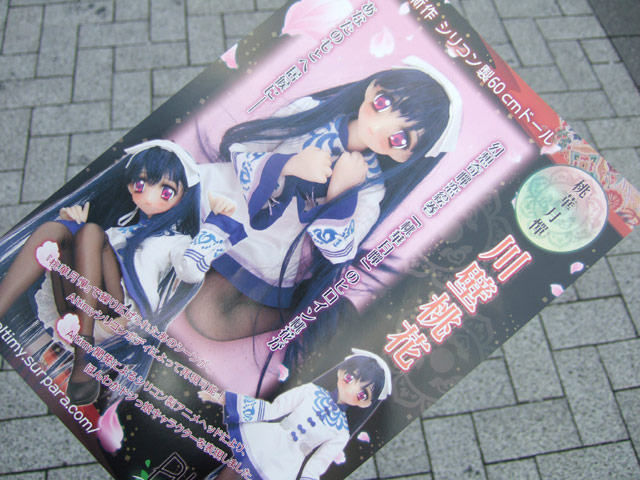 その、コスプレさんに抱えられていたアルティミィ「シリコン製60cmドール 桃華月憚 川壁桃花」(SA)のサンプルと、配布されていたチラシの表裏。